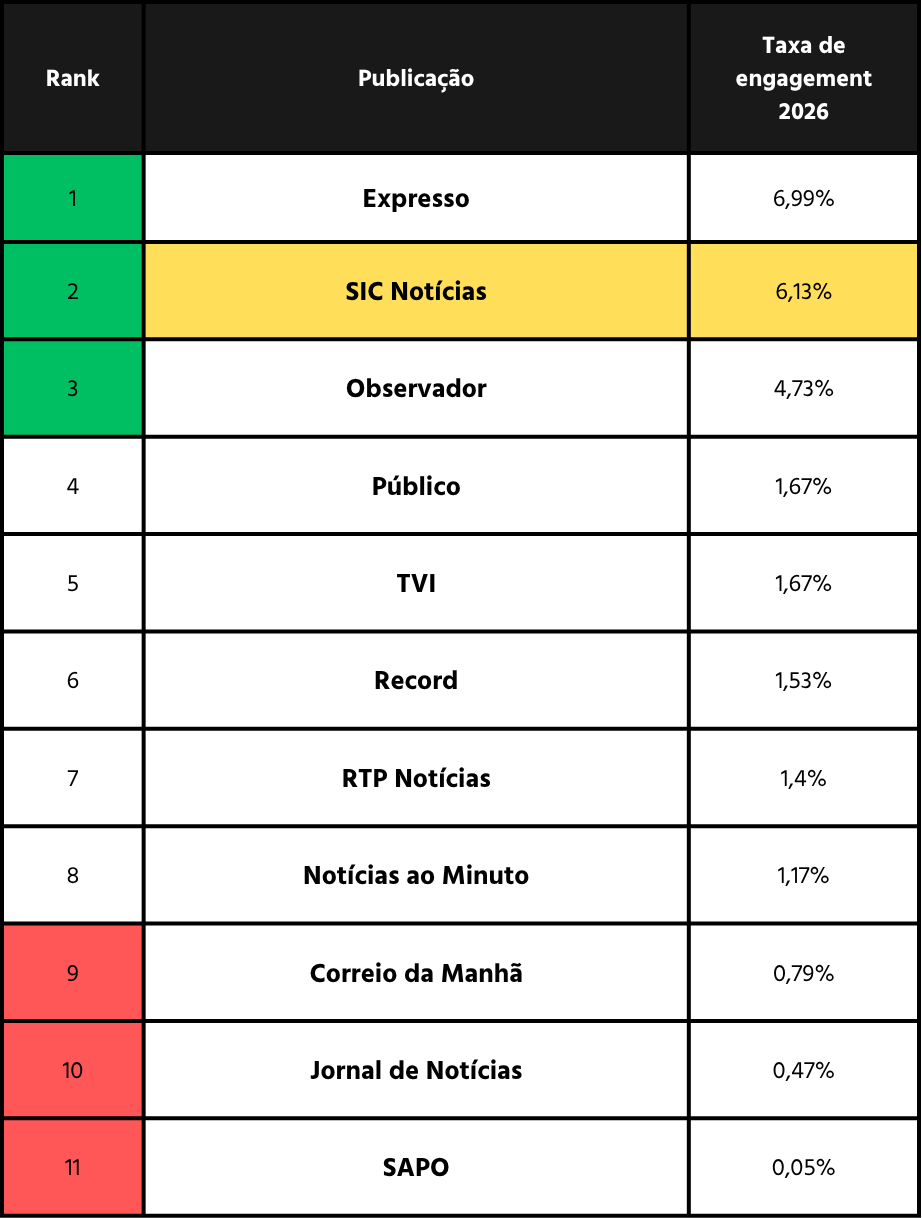 Em última análise, os dados de março de 2026 destacam um “duplo domínio” da Impresa no topo do ranking, com a SIC Notícias e o Expresso a ocuparem as duas primeiras posições em termos de engagement em Portugal. Para a SIC Notícias, esta taxa de 6,13% representa mais do que um indicador: é a confirmação do seu papel como o pulso digital do país. A capacidade do canal de gerar níveis tão elevados de interação garante a sua relevância contínua como um dos principais motores do debate público em Portugal.