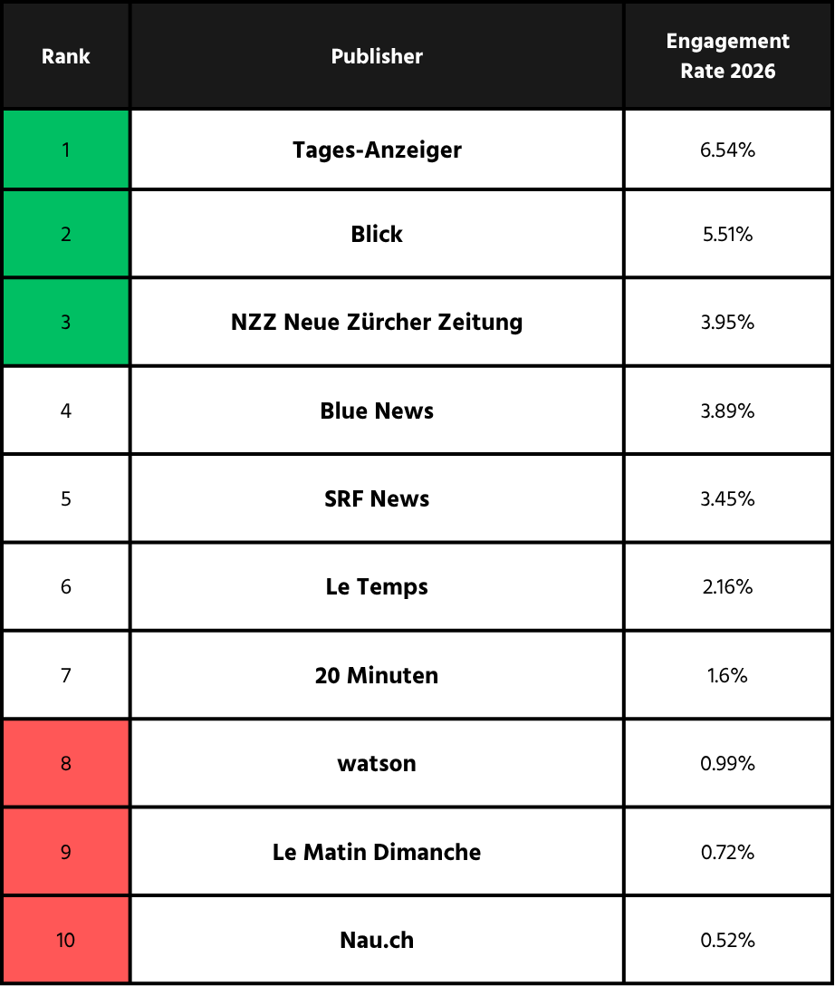 Below, we present the average engagement rates achieved by the top Swiss publishers as of March 2026.