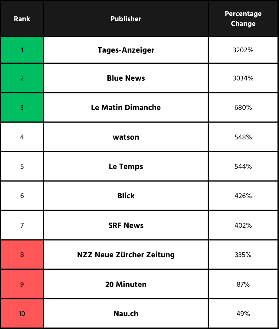 The analysis of year-over-year growth reveals several dramatic outliers within the Swiss media ecosystem: at the absolute peak of the rankings, Tages-Anzeiger achieved a surge in engagement that dwarfs its competitors, securing a lead of nearly 200 percentage points over the next closest publisher. Remarkably, its growth rate is almost equal to the combined performance of the bottom six outlets in the top ten.