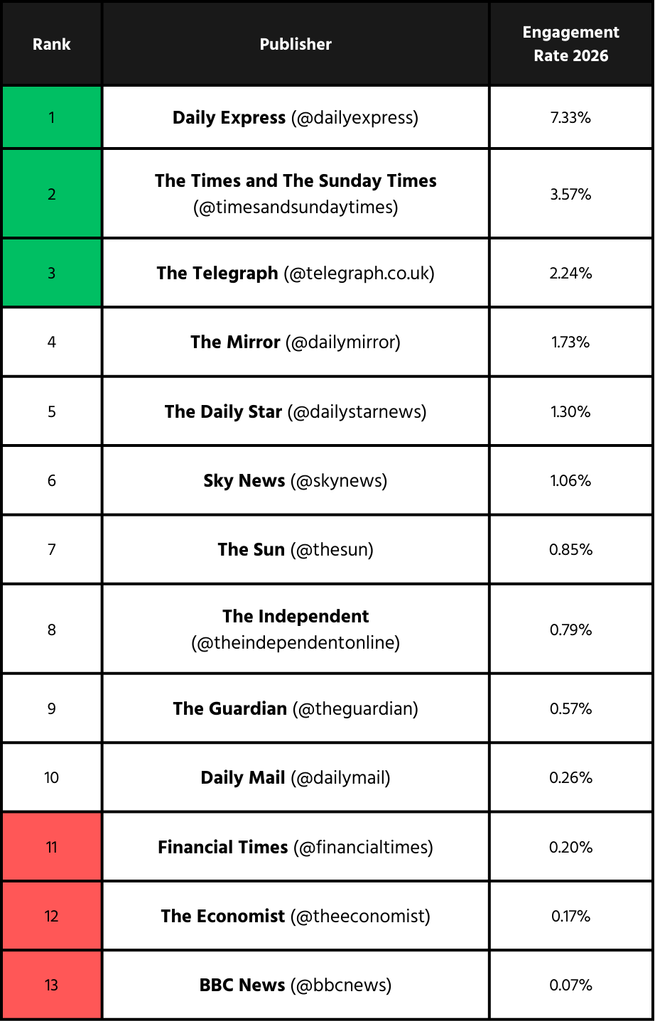 Below we present the engagement rates achieved by the top UK publishers as of January 2026.