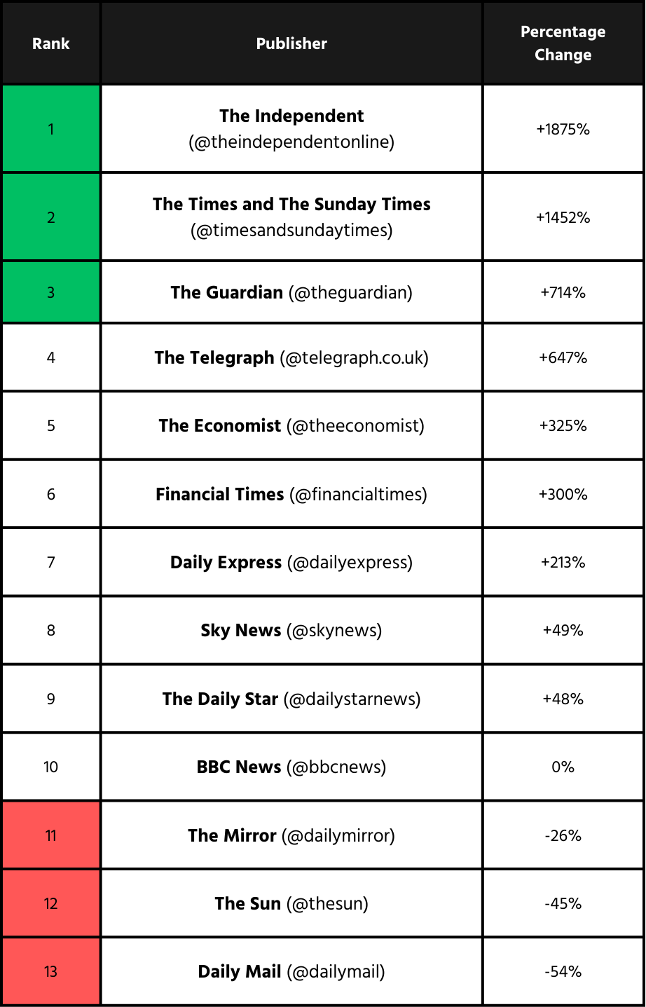 The findings present several clear outliers: At the top of the rankings, the Daily Express sees more than double the engagement rate of the next highest publisher — indeed, its engagement rate is almost as much as the second-, third- and fourth-placed publishers combined.