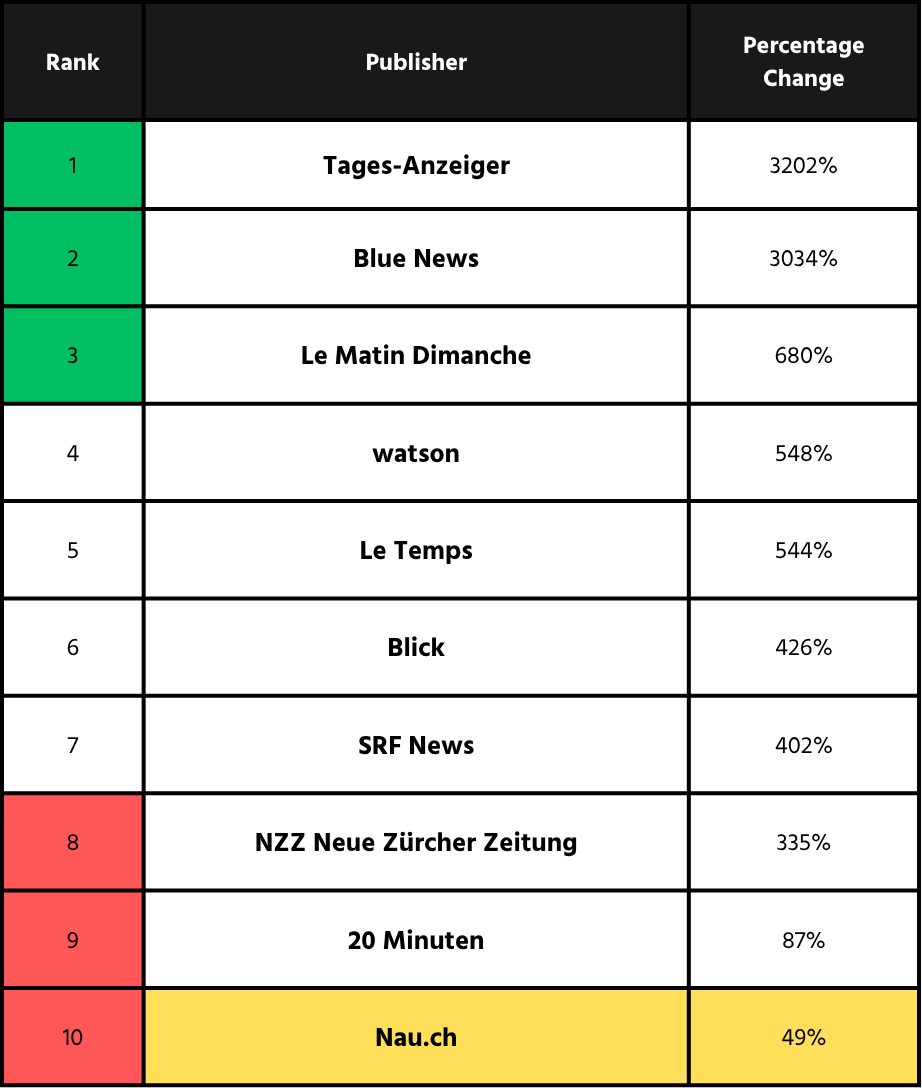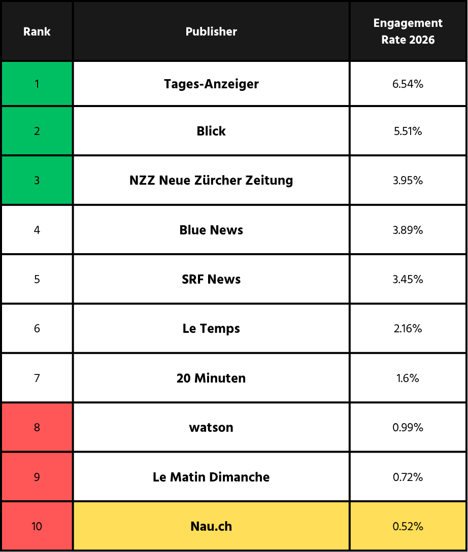 Despite its pervasive physical presence, Nau.ch ranks near the bottom for social engagement among Swiss publishers in 2026.
