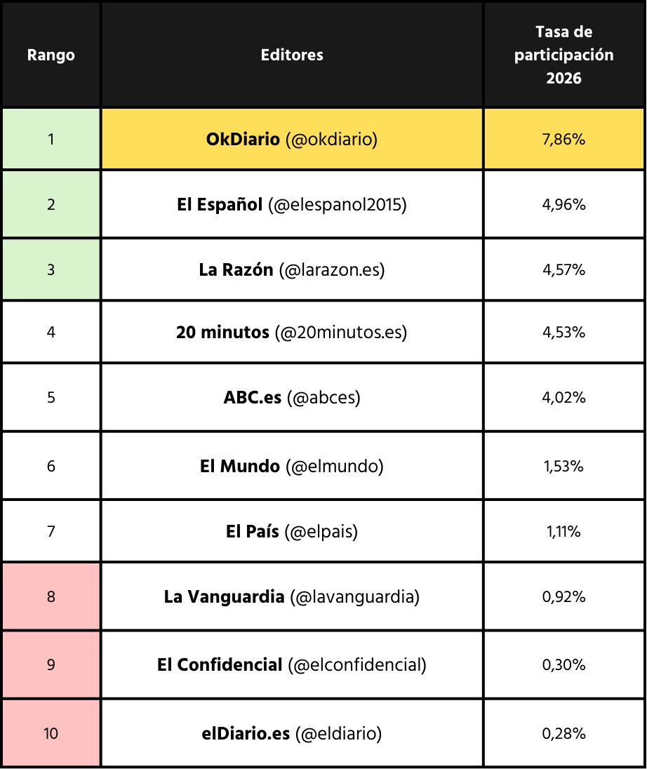 La magnitud de este liderazgo resulta aún más evidente al compararlo con el conjunto del mercado. El engagement de Okdiario es casi el doble que el de su rival digital más cercano, El Español, que registra una tasa del 4,96%. La diferencia entre Okdiario y el último medio del top diez es todavía más marcada, con elDiario.es registrando una tasa de apenas el 0,28%. Esta enorme brecha sugiere que Okdiario ha encontrado una fórmula específica para lograr viralidad en redes sociales y fidelidad de audiencia que los modelos editoriales tradicionales aún no han conseguido replicar.