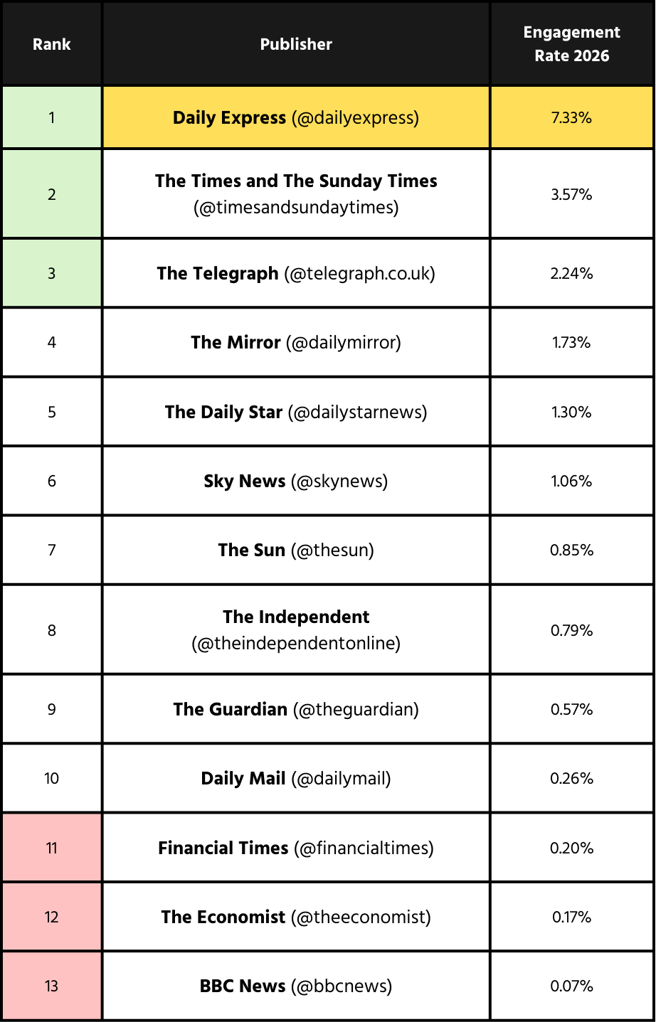 By more than tripling its performance from the previous year, The Daily Express has achieved a 7.33% average ER, making it the mid-market leader in engagement growth. This suggests that while fewer people are picking up the physical paper, the brandâs ability to spark conversation online has never been stronger. By treating social platforms as primary destinations rather than afterthoughts, The Daily Express has effectively future-proofed its legacy.